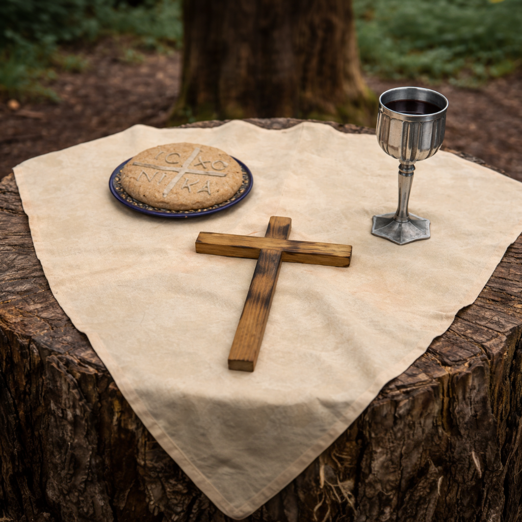 Bread and wine. We believe that the risen Jesus offers himself freely to everyone at his Table, so if you are ready to receive him in that way, please come prepared with a piece of bread and a glass of wine or water. It is also perfectly fine to abstain.